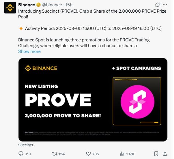 Binance is hosting the PROVE Trading Challenge (Aug 5–19) with a 2 million PROVE pool and a separate $100K CreatorPad campaign until November. These events occur monthly or quarterly, aligning with sustainable growth.