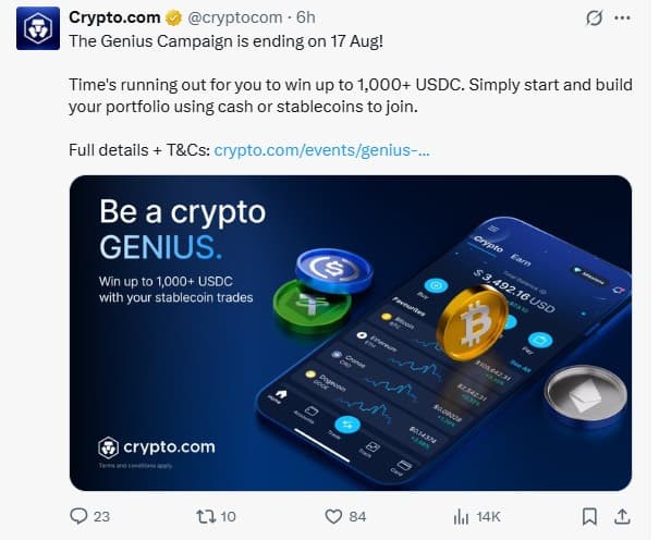 Crypto.com launched the Genius Campaign (July 18–Aug 17), offering up to 1,000 USDC and 50% cashback for first-time buyers. Its promotions are typically monthly.
